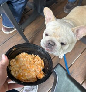 Speaking of lunch time, or meal time in general, make sure to pack at least a baggie of a single serving of their kibble and a plastic or collapsible bowl. If your four-legged eats fresh food like mine, the package will need to be completely frozen to pass TSA inspection. So be prepared to warm it up in the terminal’s bathroom sink once it’s time to eat. When we flew on our last trip, I packed all of his food (frozen and sorted into meal bags labeled by meal and date) in my other carryon. The last thing I wanted was to risk his food getting lost or delayed from the change in airplanes. I’d have a very hungry boy and a smelly mess to clean up!